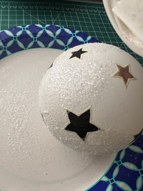 Repeat Step 1 for new ornament. This time when you go to apply glitter put a fresh paper plate under the ornament and use the preexisting paper plate with the glitter to sprinkle it over your applied glue.