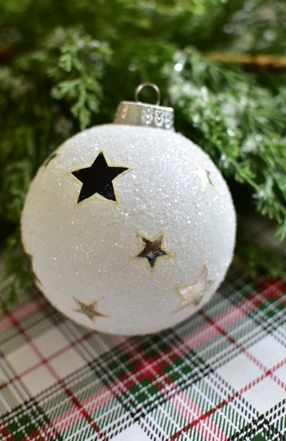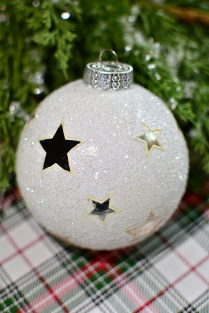 Step 3: After you have applied the paint, transfer a fresh paper plate under the ornament and begin sprinkling the glitter over the ornament (allowing the paper plate to catch the fallen glitter). Give the ornament a shake onto the paper plate to release any excess glitter. Put the ornament aside to dry and work on another while its resting.